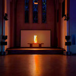 Dem pränatalen Hören ist eine Seitenkapelle gewidmet. Diese Gestaltungsidee ergab sich aus dem beruflichen Kontext, Dirk Beckedorf arbeitet mit der Hörtherapie, deren Bestandteil diese pränatale Erfahrung ist. Es erklingt über Lautsprecher eine weibliche Stimme, so wie wir sie als Babys im Bauch unserer Mutter gehört haben. Nach Momenten des Lauschens in diesem besonderen Raum des Rückzugs treten die BesucherInnen durch einen Vorhang zurück in die große Kirche und können die Bilder noch einmal mit frischen Augen auf sich wirken lassen.
