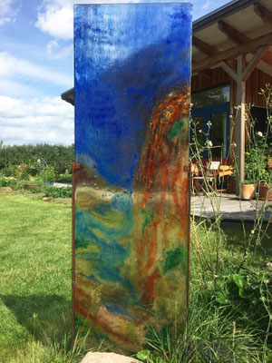 In den Glasarbeiten entfaltet sich das Spiel von Farbe und Form in einer besonderen Weise. Je nach Tageszeit, Licht und Hintergrund verändert sich die Farbwirkung. Mal erscheint das Blau tief gesättigt in der blauen Stunde, dann wieder in der Morgensonne funkeln die Lufteinschlüsse und wirken wie Wassertropfen im Sonnenlicht. So interagieren der gewählte Standort und die Tageszeit in lebendiger Weise mit dem Kunstobjekt.